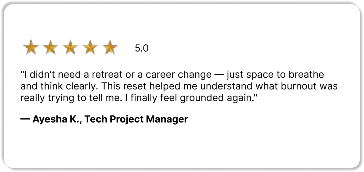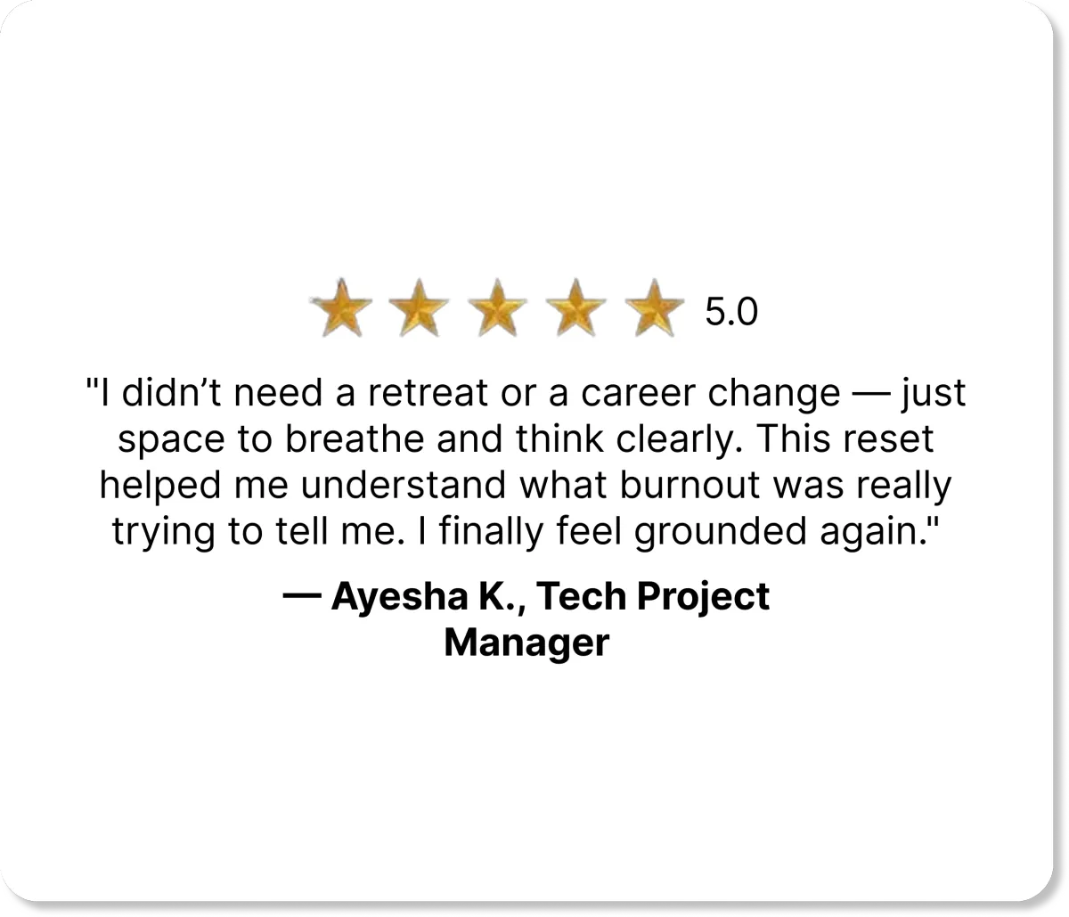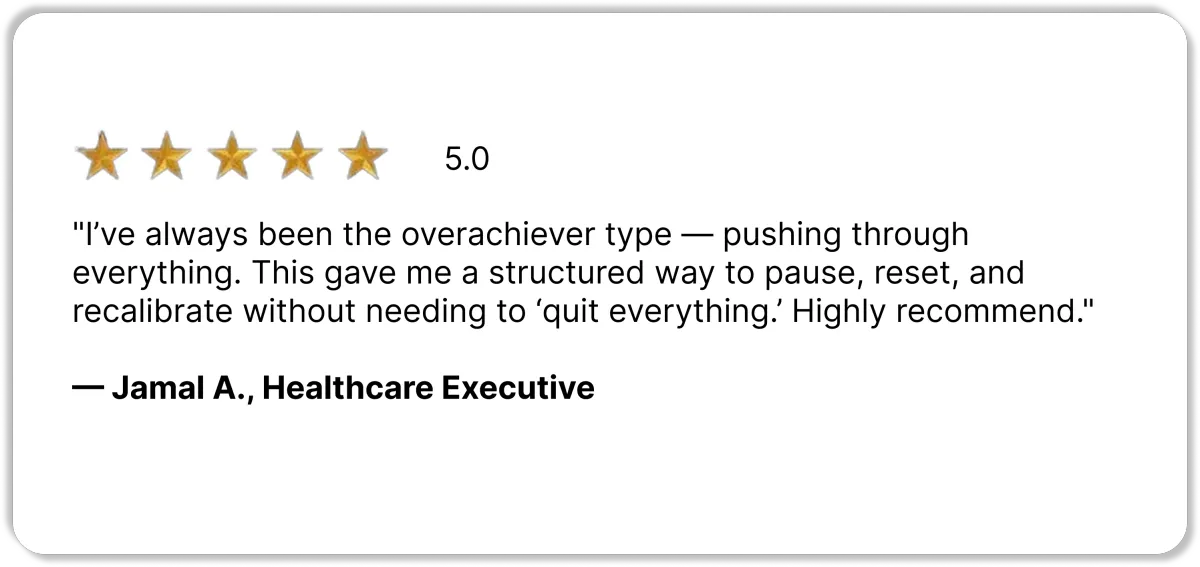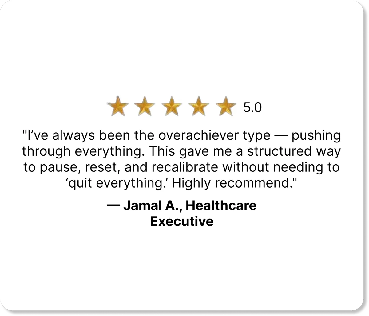 Ambitious professionals in high-pressure roles who are feeling exhausted, disconnected, or stuck, and want to recover without sacrificing their career progress.